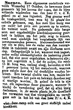 De bekende streekschrijver schoolmeester Norbertus Panken uit Bergeijk schrijft in zijn dagboek: “Een ontzettende ramp had ’s middags ong. 12 u. te Nunen, Woensdag 17. plaats. Bij dit dorp, op gebied van Gerwen, was men sinds 2 maanden bezig, voor van den Eijnde te Dommelen een wind-graanmolen te bouwen. Ter hoogte van omstr. 15 meters opgetrokken stortte hij in, terwijl 5 personen zich boven bevonden, waaronder W. van den Eijnde en zijn Zwager J. Baken, die het werk stonden te bezichtigen. (…) Wonderlijk bekwamen de meesten geen erge wonden, doch een zeer brave 18 jarigen jongen, onder de molen arbeidende is verpletterd. Zie Meij.c. van 19 dezer.”